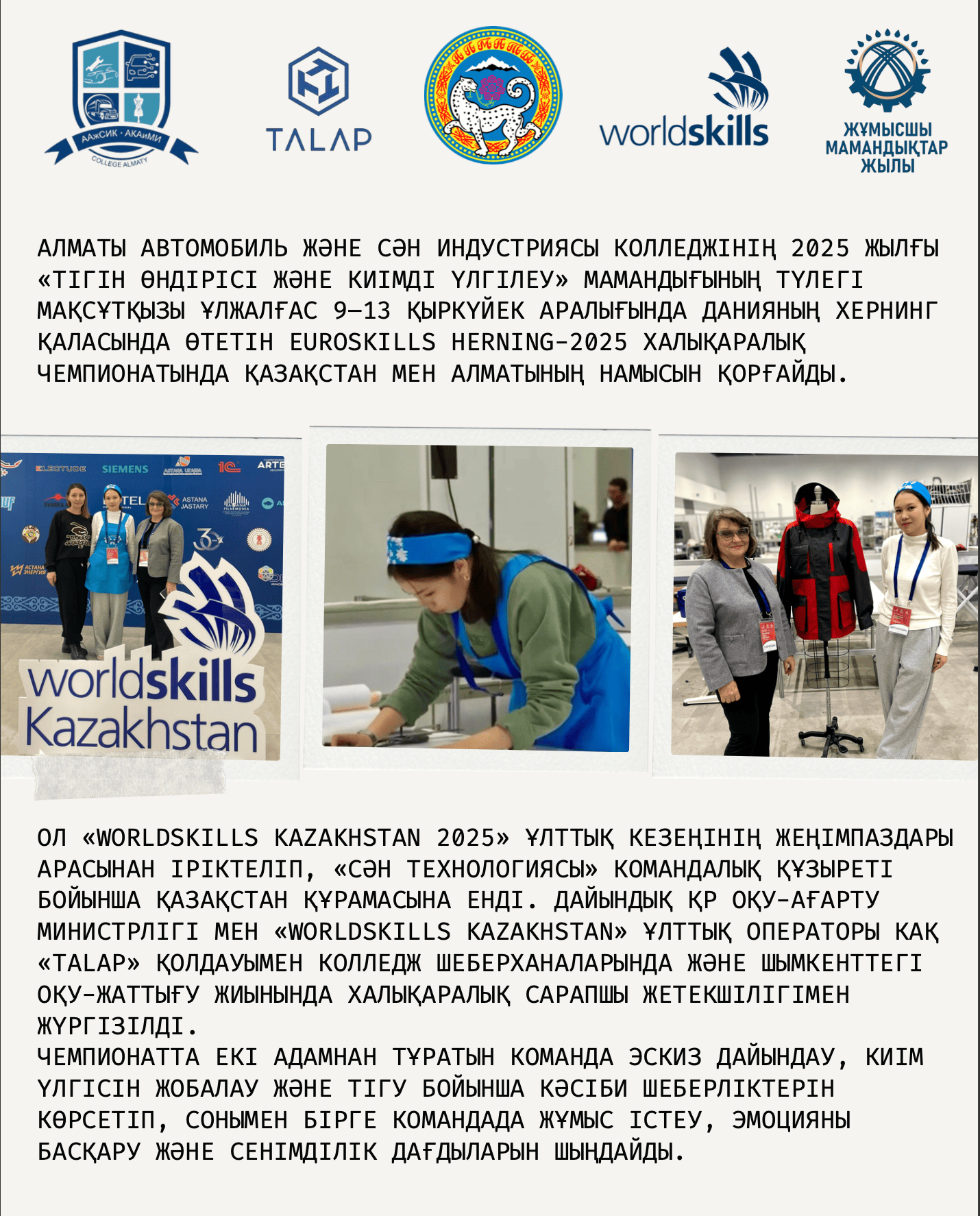 МАҚСҰТҚЫЗЫ ҰЛЖАЛҒАС EUROSKILLS HERNING-2025 ХАЛЫҚАРАЛЫҚ ЧЕМПИОНАТЫНДА ҚАЗАҚСТАН МЕН АЛМАТЫНЫҢ НАМЫСЫН ҚОРҒАЙДЫ.