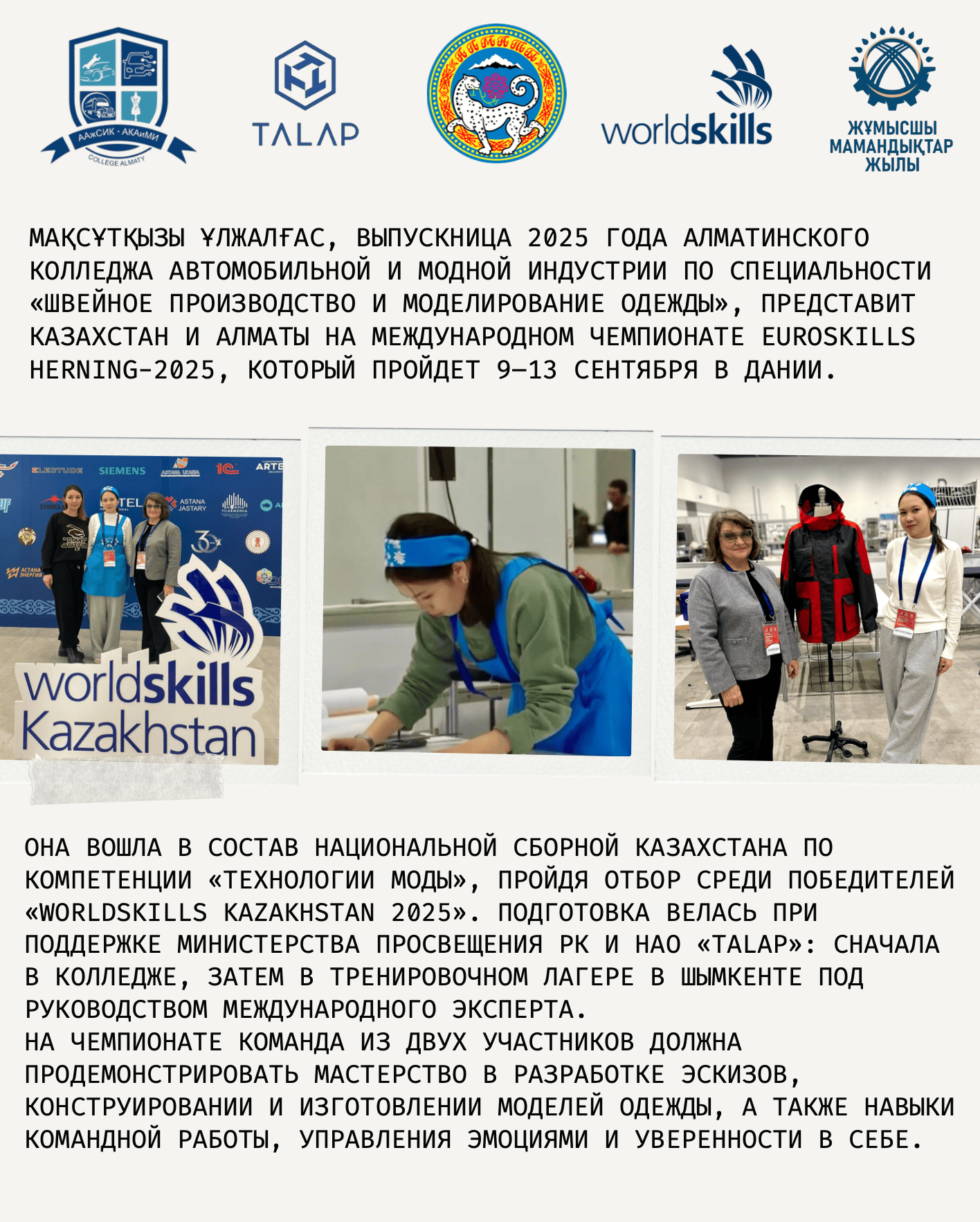 МАҚСҰТҚЫЗЫ ҰЛЖАЛҒАС ПРЕДСТАВИТ КАЗАХСТАН И АЛМАТЫ НА МЕЖДУНАРОДНОМ ЧЕМПИОНАТЕ EUROSKILLS HERNING-2025